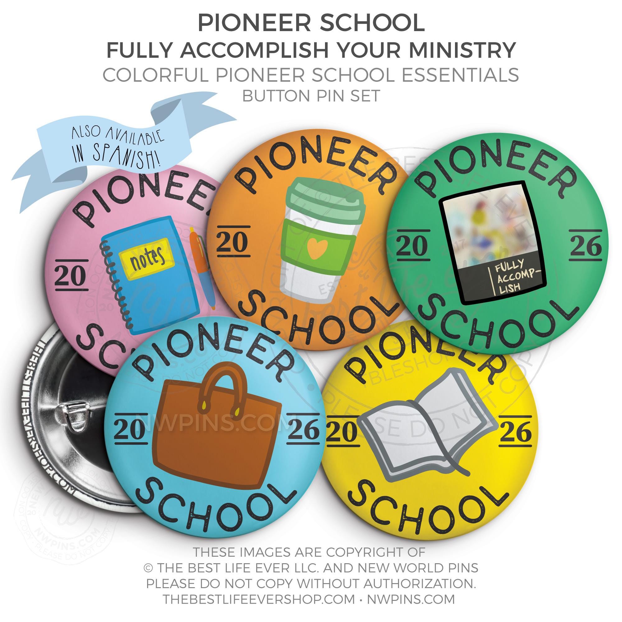Share with all your fellow pioneer school classmates! Comes in sets of 5 (1 of each color), with each button featuring one of the many important things essential to the pioneer ministry.