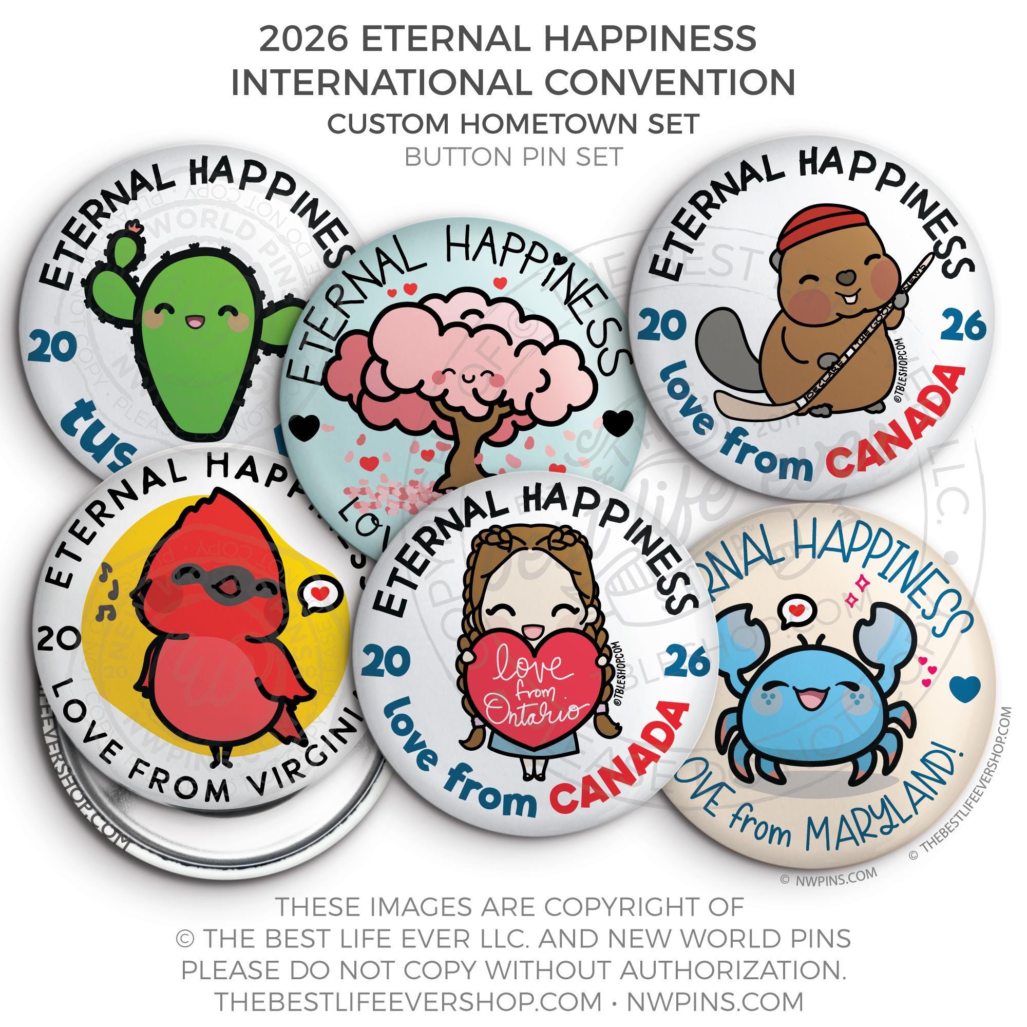 Are you headed to an international convention this year? Congratulations!! We are so excited for you, and we have created this option so that you can bring extra special gifts with you to share with all of your new friends. Choose up to 5 custom button pins especially chosen by you with things that represent your hometown!
