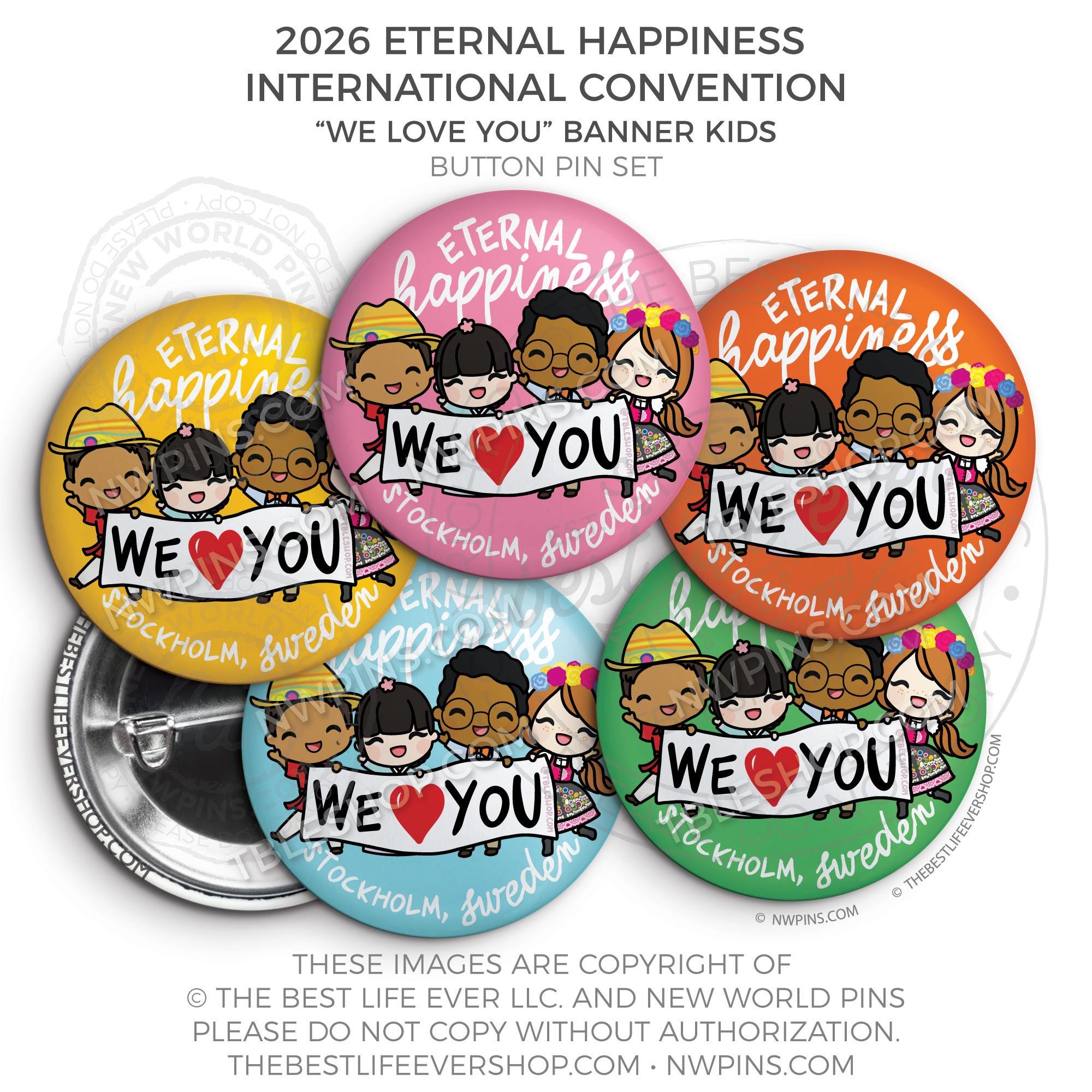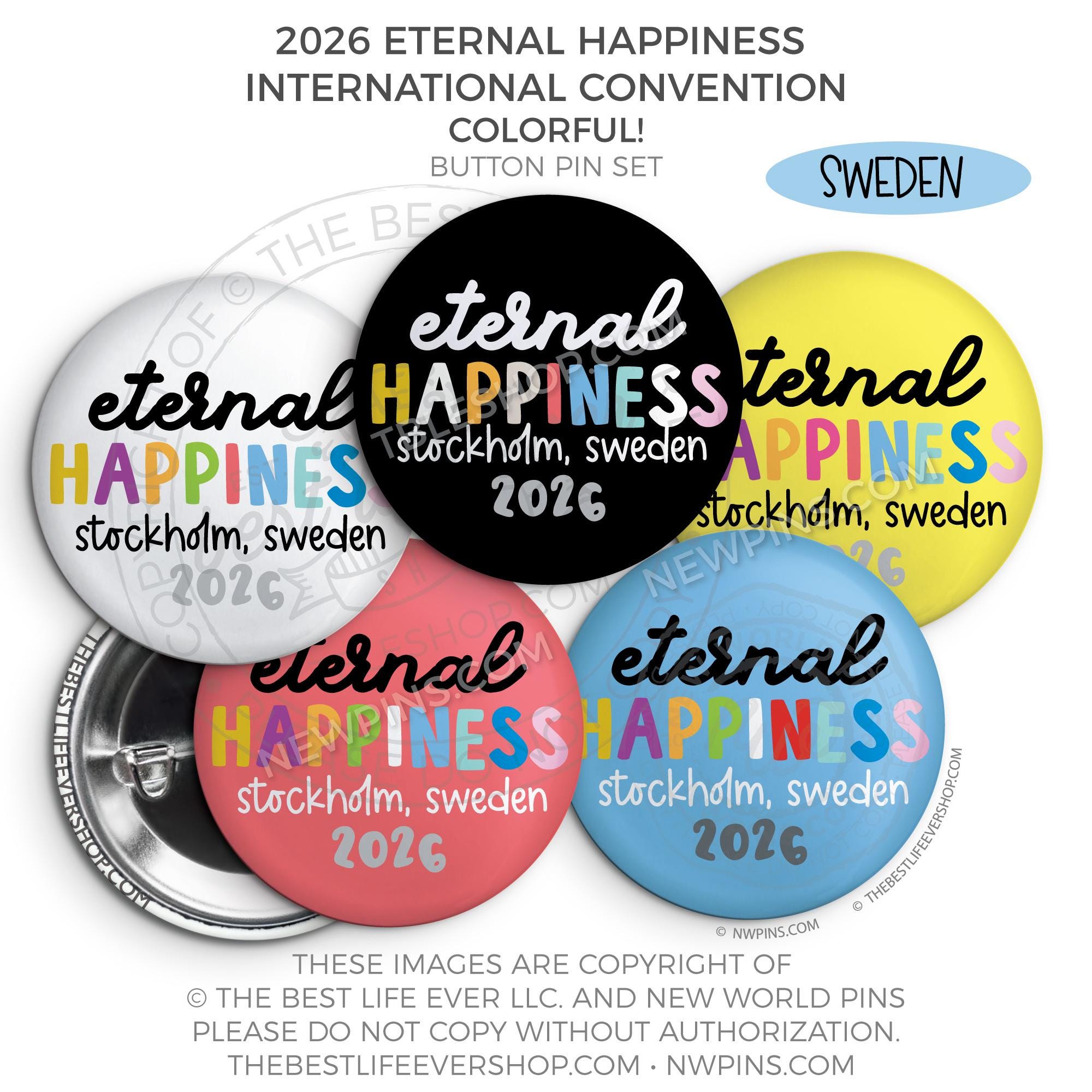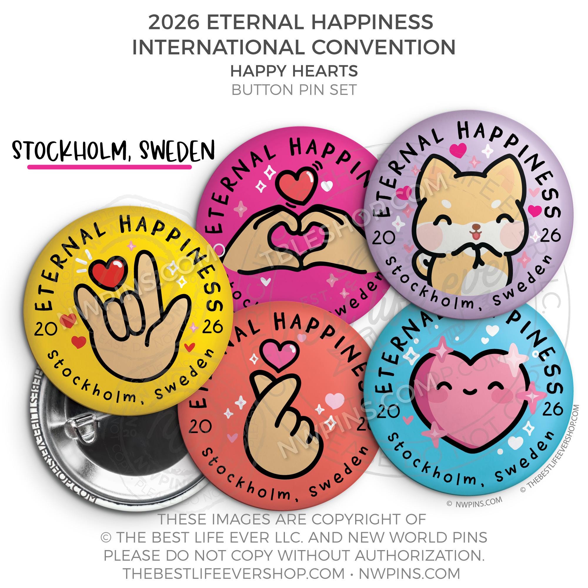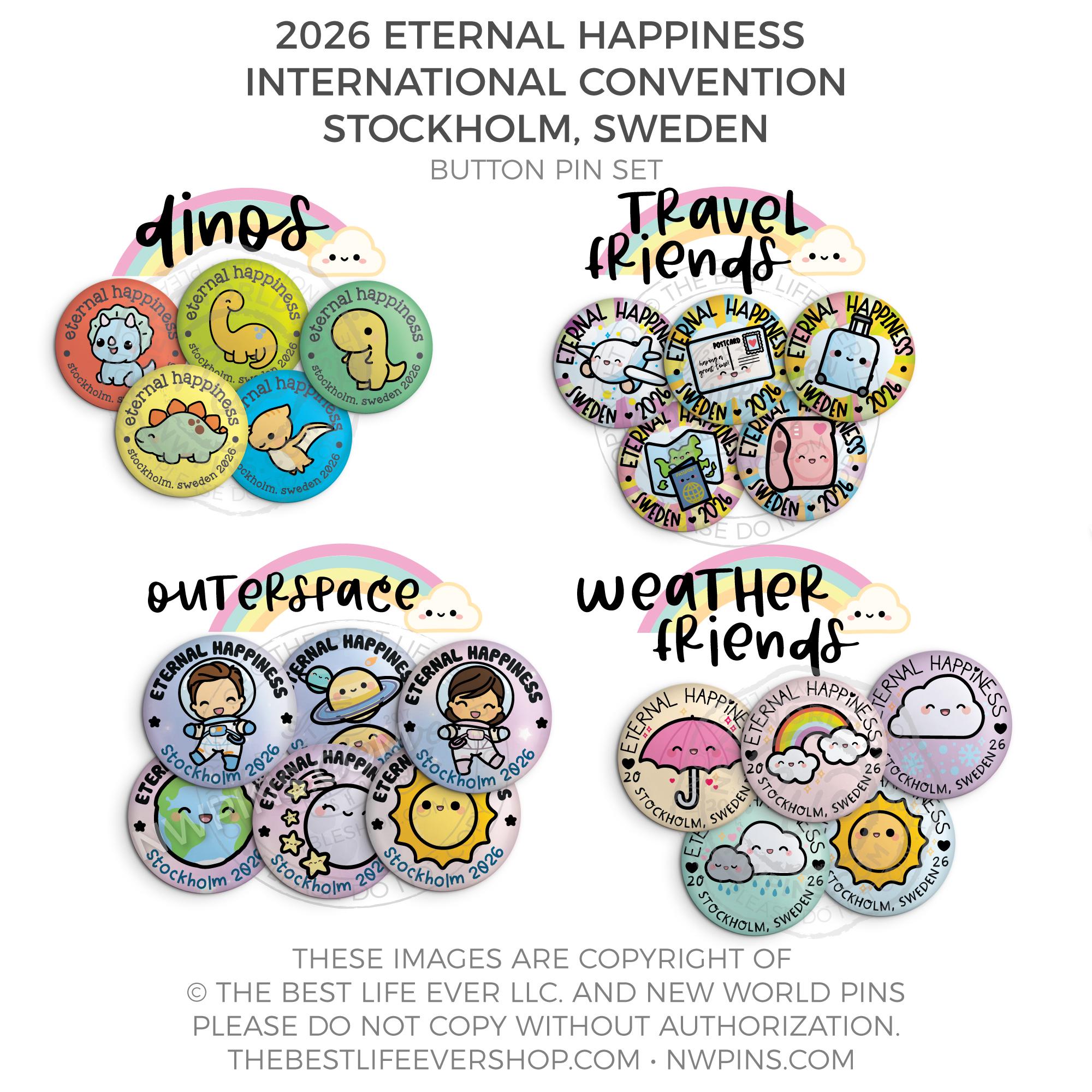 ❤︎ Eternal Happiness 2026 Stockholm, Sweden International Convention Button Pins Party Pack ❤︎