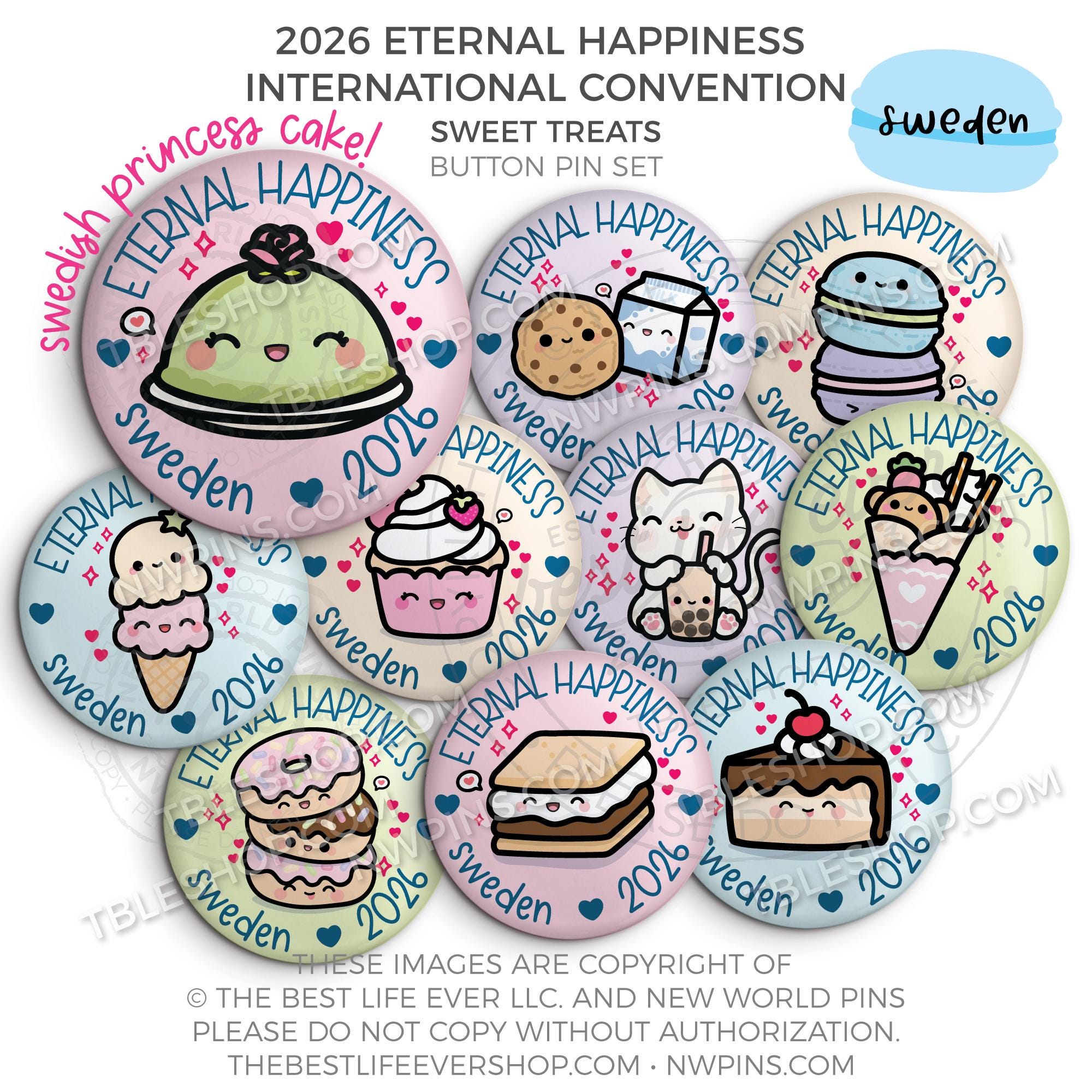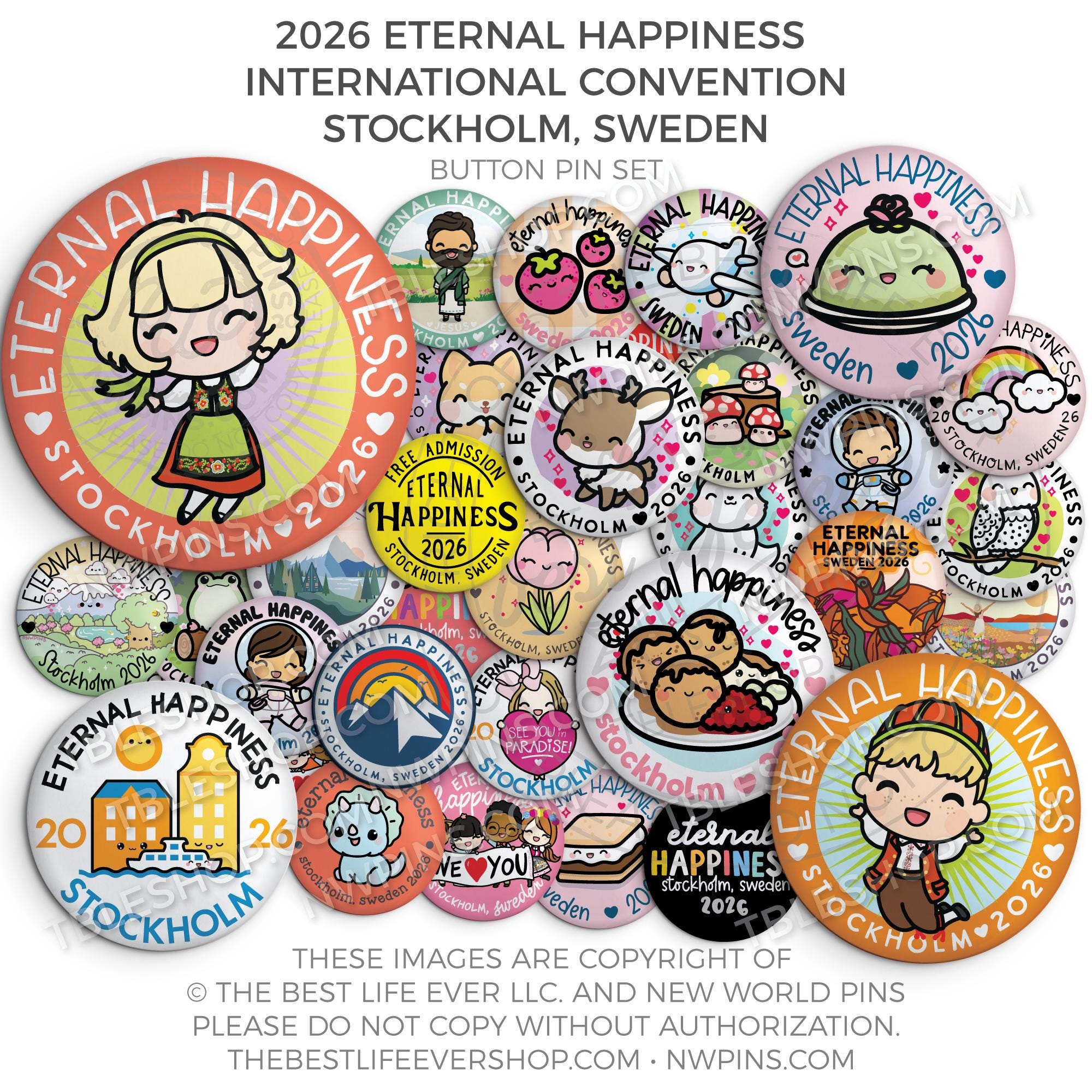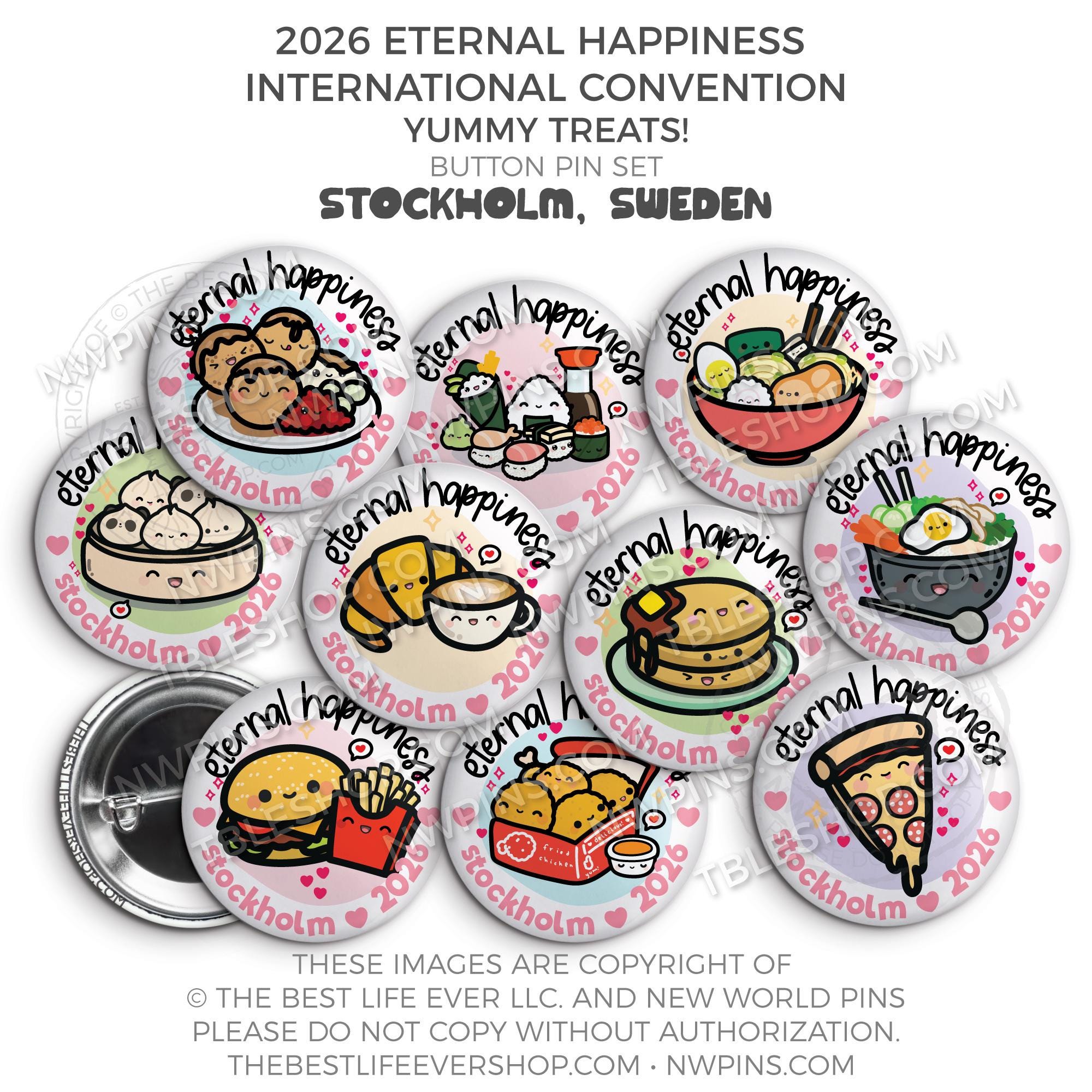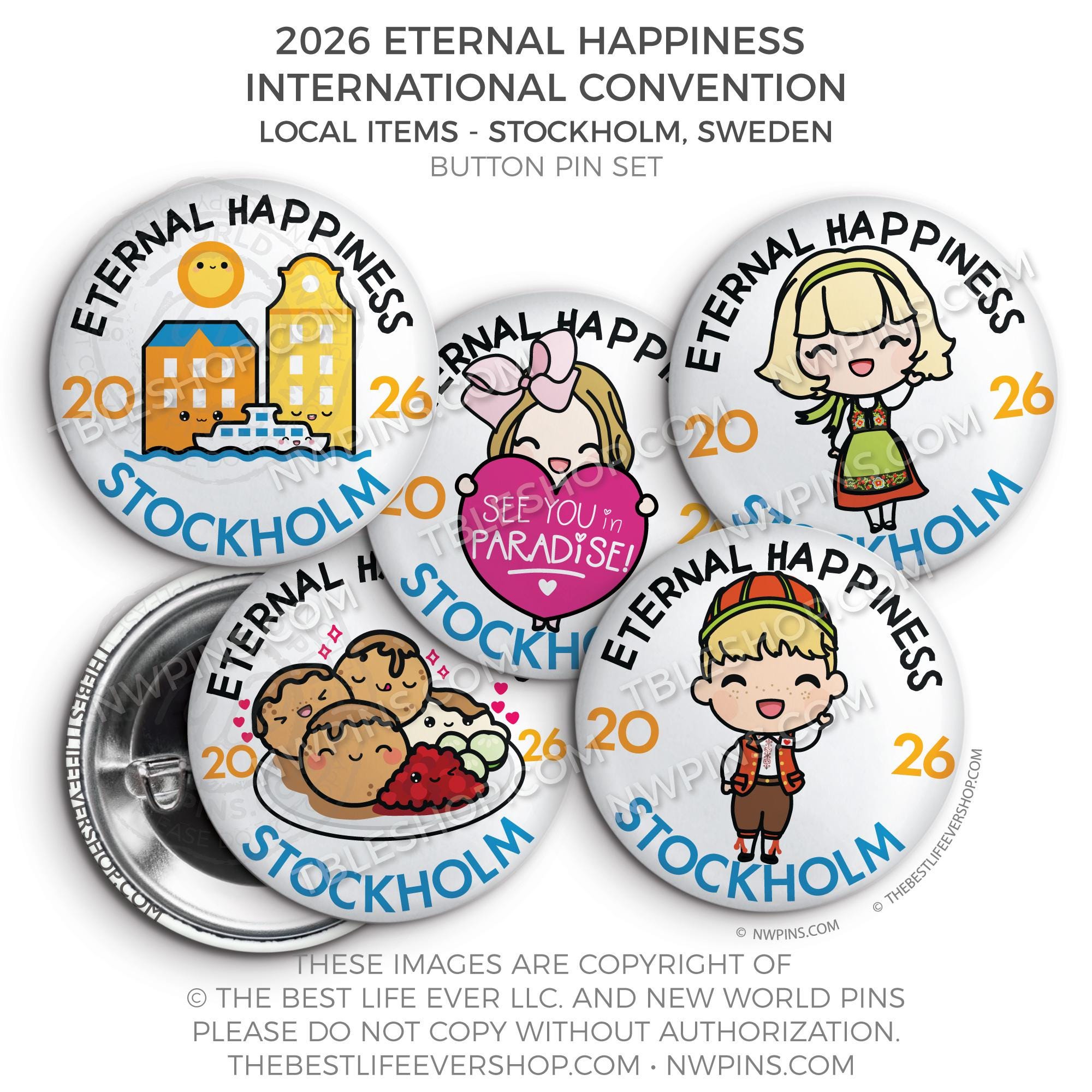 ❤︎ Eternal Happiness 2026 Stockholm, Sweden International Convention Button Pins Party Pack ❤︎