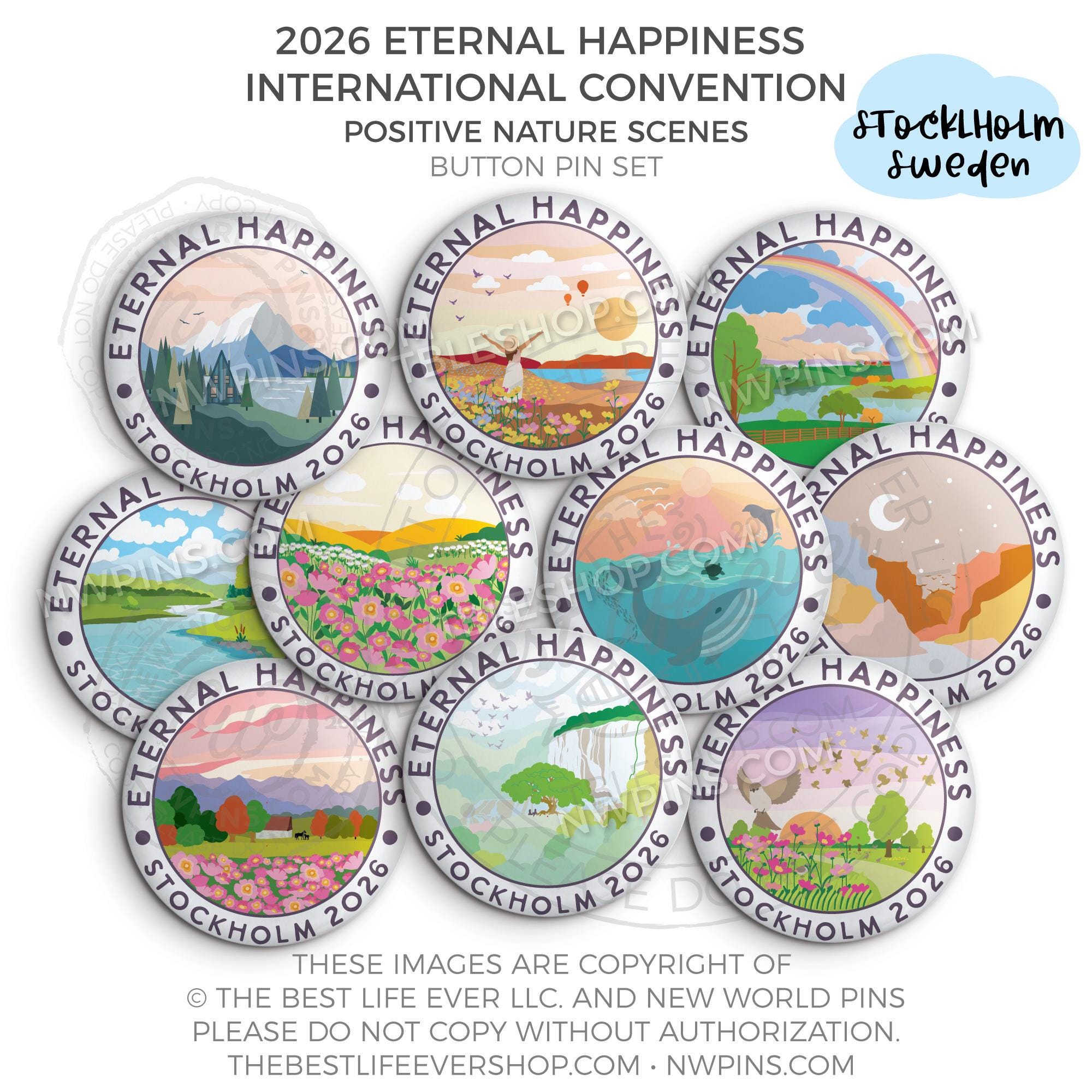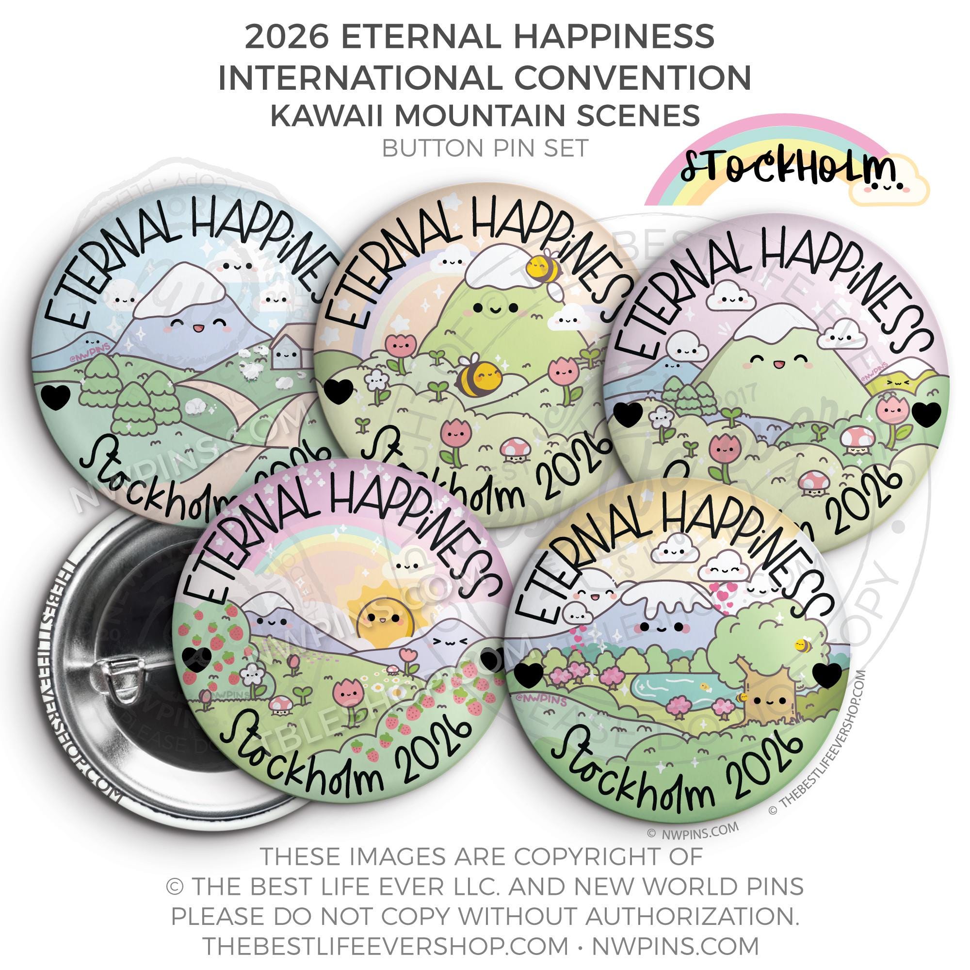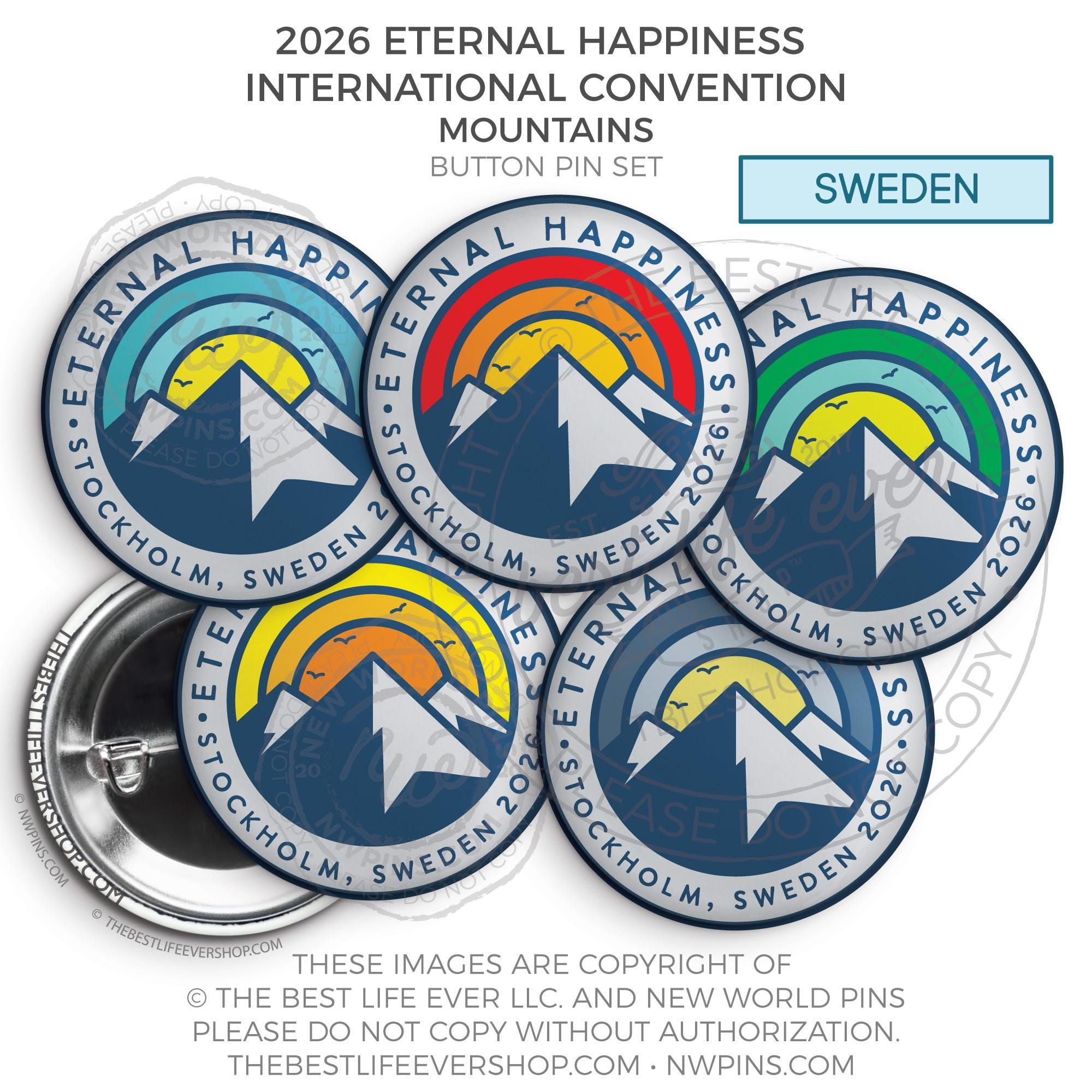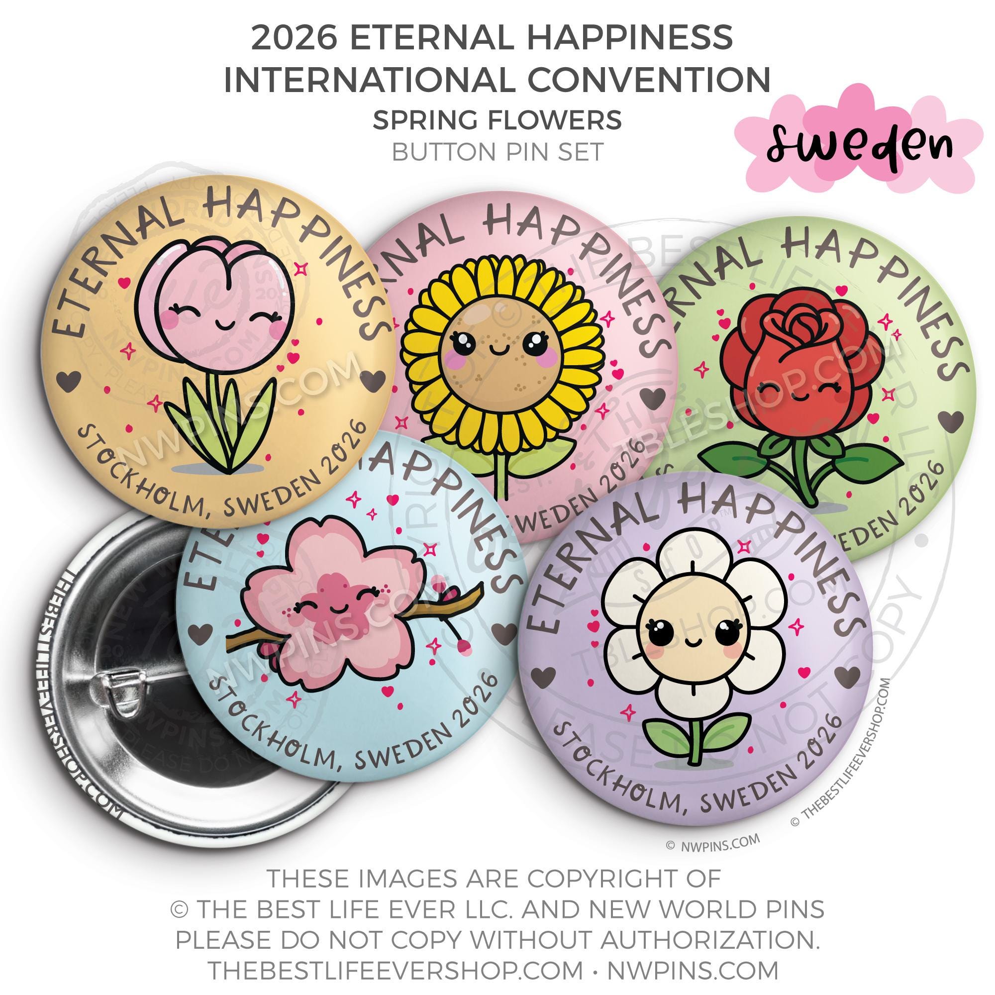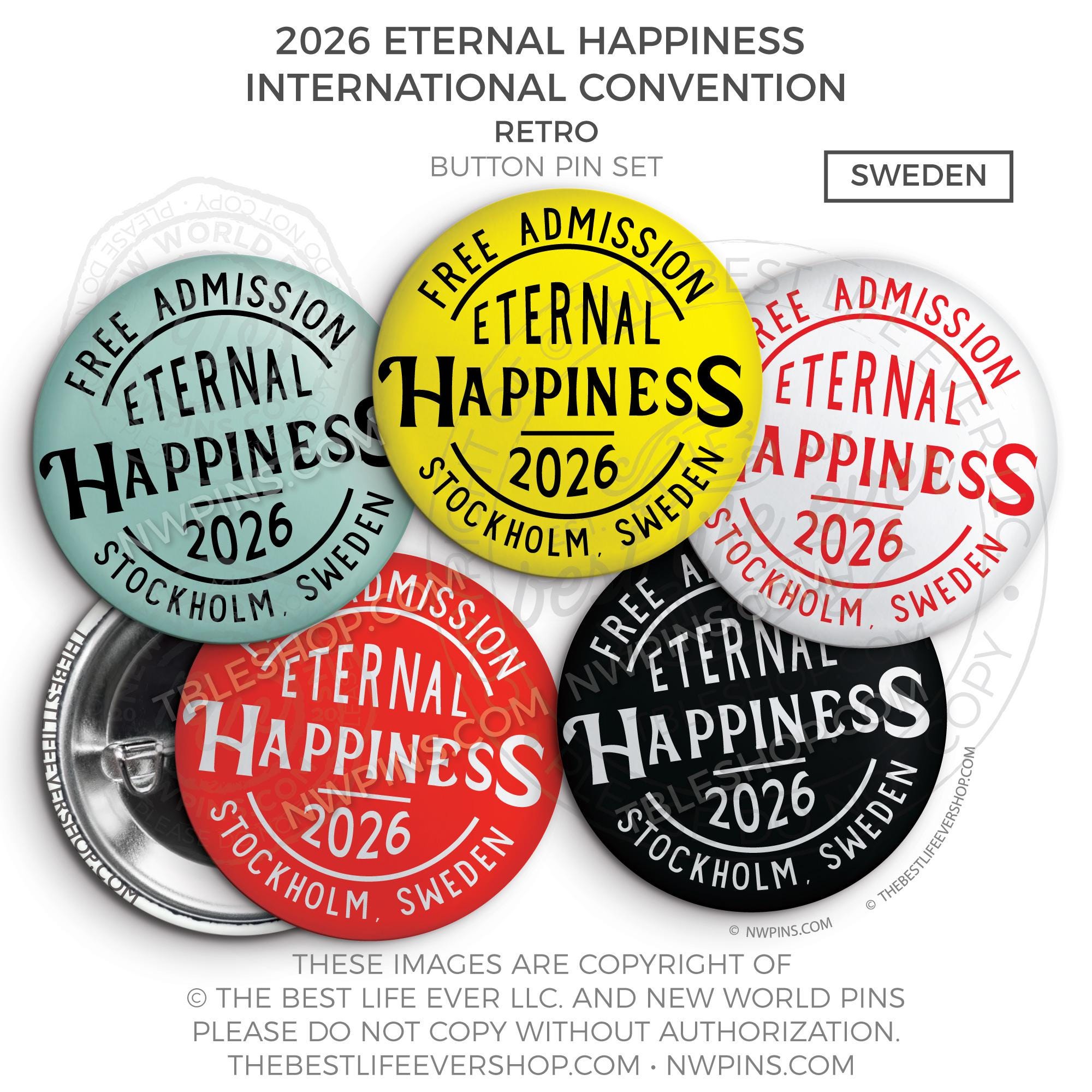 ❤︎ Eternal Happiness 2026 Stockholm, Sweden International Convention Button Pins Party Pack ❤︎