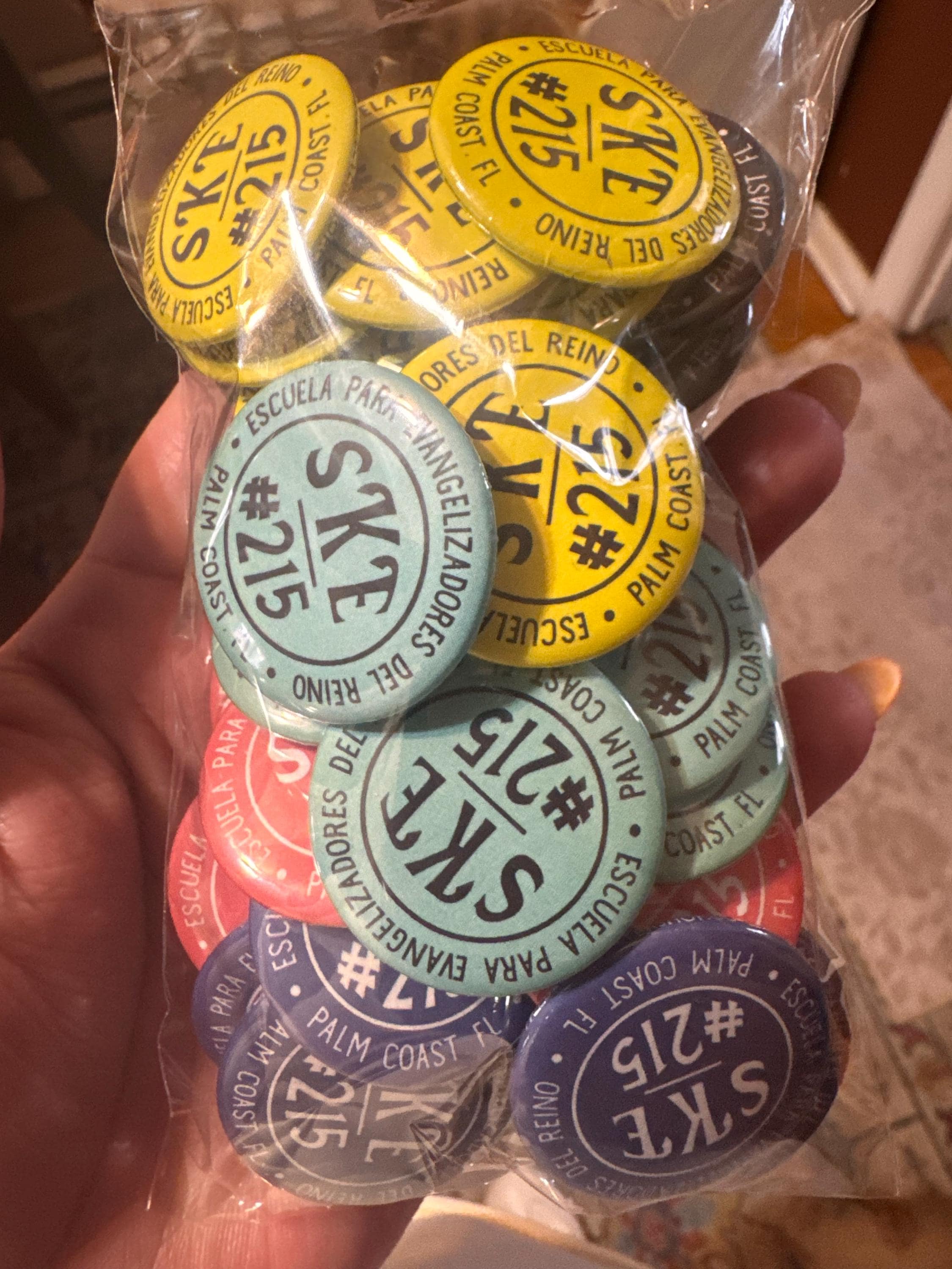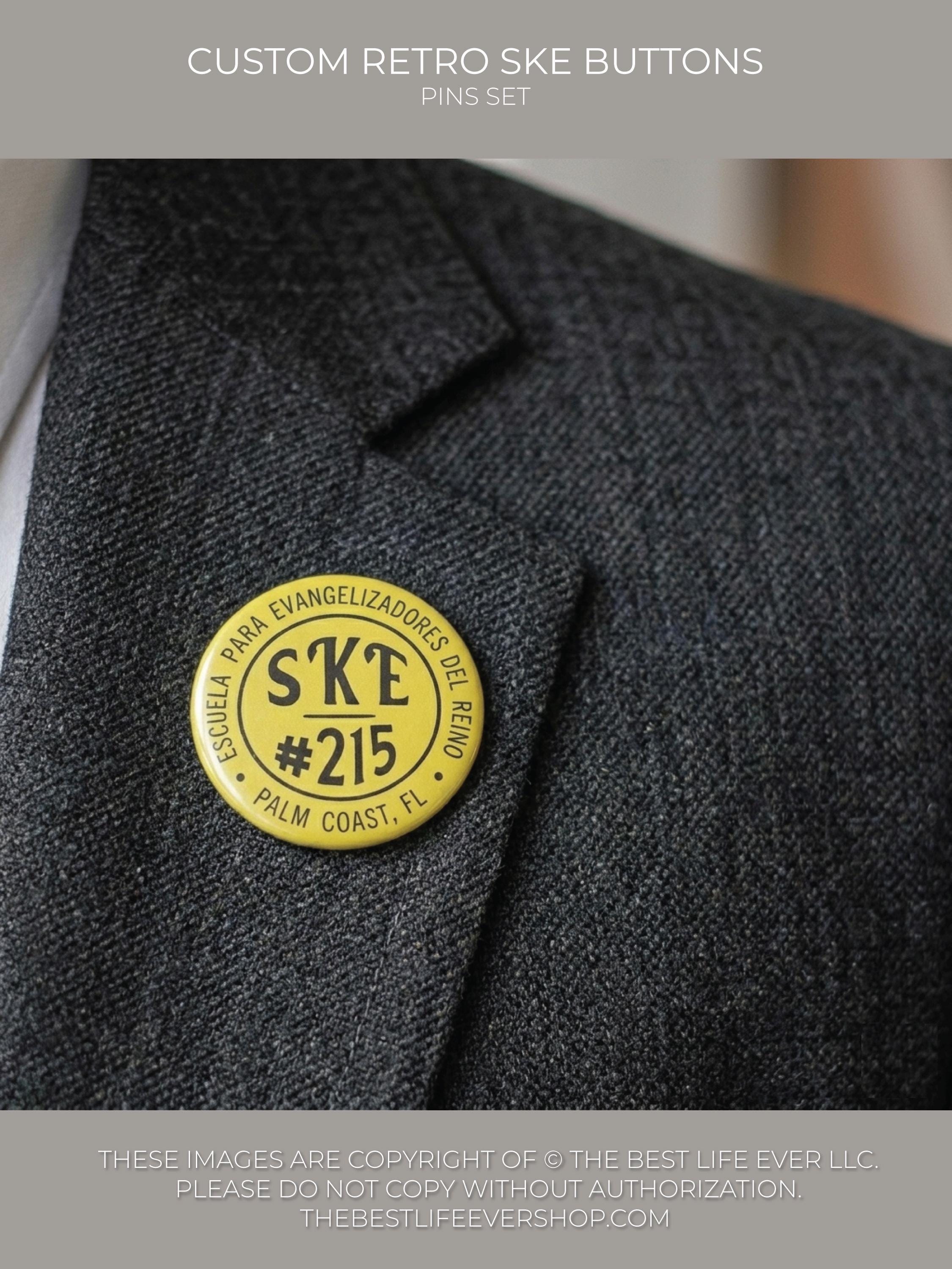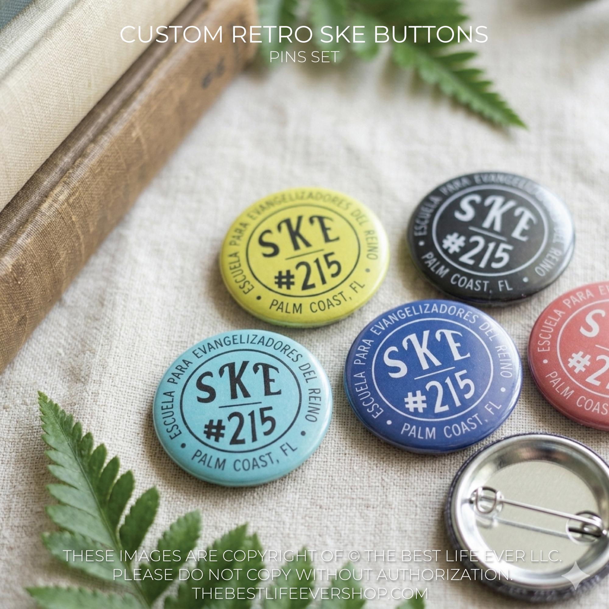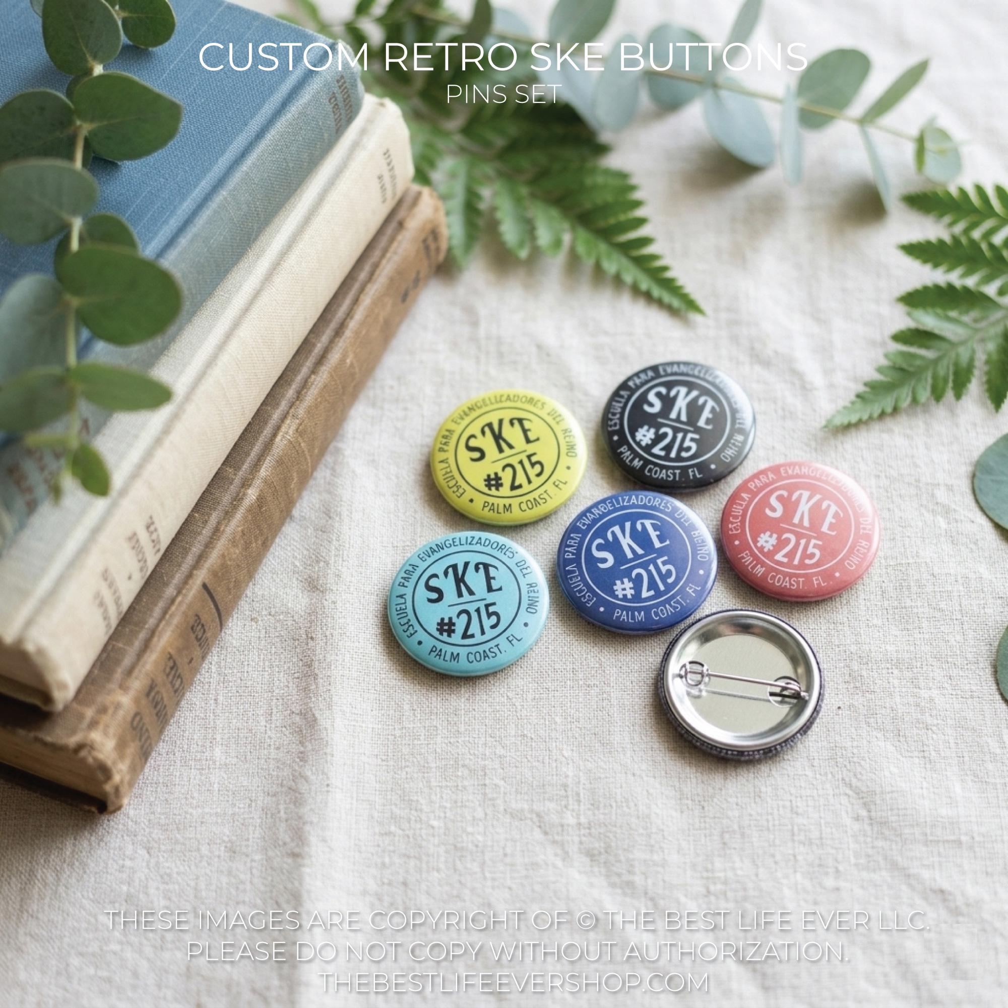 Customizable Retro SKE Button Pin Set - School for Kingdom Evangelizers. These make the perfect little gift. You can customize it with your class number and/or location. We can also do other languages!